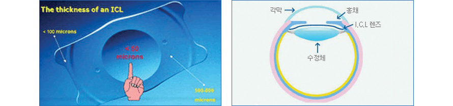 I.C.L - ¾È³»·»Áî»ðÀÔ¼ú(Implantable Contact Lens)I.C.LÀº ¾È³» ·»Áî »ðÀÔ¼ú(Implantable Contact Lens)ÀÇ ¾àÀڷΠȯÀÚÀÇ ±¼Àý ÀÌ»ó¿¡ ¸Â´Â Ư¼ö Á¦ÀÛµÈ ·»Á ´« ¼Ó¿¡ °¥»öÀ» ¶í ȫä µÚ¿Í ´«ÀÇ ·»ÁîÀÎ ¼öÁ¤Ã¼ ¾Õ »çÀÌ ÀÇ ÈĹæ(posterior chamber)À̶ó´Â °ø°£¿¡ ¼ö¼ú·Î ³Ö¾î ¿µ±¸ÀûÀ¸·Î À§Ä¡½ÃÄÑ ½Ã·ÂÀ» ±³Á¤ÇÏ´Â ·»ÁîÀÔ´Ï´Ù.